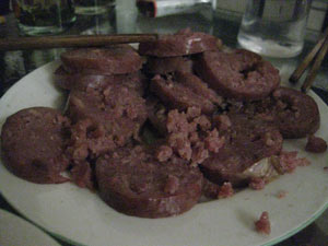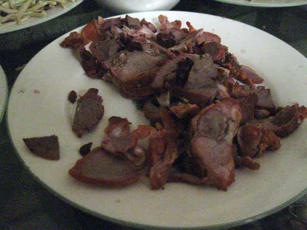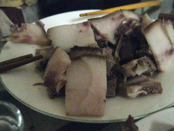 und noch eine Fleischsülze, alles Delikatessen der Gegend. Hier ist es auch, wo ich meinen ersten Bai Jio Schnapps in China trinke. Es ist ein Kornschapps aus Reis oder Hirse und ein Zeug von dem Ray, sagt, Bai Jio schmecke am besten, wenn der Geschmack vorbei wäre. Er hat recht.