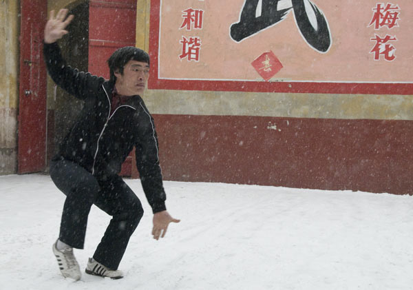 Der eigentliche Grund der Reise war die Idee ein von den Meihuaquan Gemeinden veranstaltetes Fest zu drehen. Ray sprach von 10 000 Menschen die kämen, um sich die Darbietungen der verschiedenen Wushu Schulen zu Ehren des Festes anzuschauen. Am heutigen Sonntag wollten wir die letzten Vorbereitungen der Schule drehen. Der Höhepunkt sollte dann das große Treffen der Wushuschulen werden. Der Neuschnee und der Frost in der Nacht werden diesen Plan unters Eis bringen. Doch davon später.