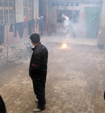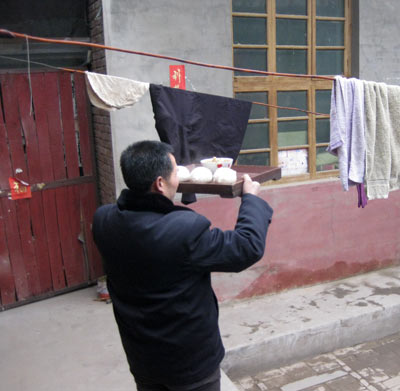 Zuerst wird eine Portion Essen geopfert. Lu Chao brennt im Innenhof eine Knallerkette ab und sein Vater trägt würdig ein Tablett mit Suppe und Klößen in den Hof.