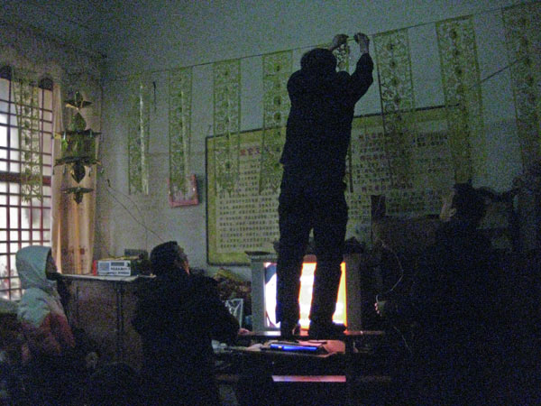 Der Meihuaquan Tempel ist nicht nur religiöses Zentrum der Gemeinde, sondern auch soziales Zentrum. Im Innenhof trainiert die Wushu Schule. Ein Spender, der anonym bleiben will, hat der Gemeinde einen Computer mit Internetanschluss geschenkt. Er steht neben dem Fernseher. Ray berichtet, dass sich die Gemeinde oft die Vorführung ihrer Wushu Kämpfer anschaut. Also bitten wir sie uns drehen zu lassen, wie sie das tun. Da im Tempel bis auf ein paar Leuchtstoffröhren keine Lampen brennen, hängt Vater Lu eine Glühbirne über die Girlande mit Scherenschnitten damit wir drehen können.
