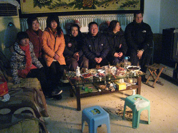 Nach dem obligatorischen Familienbild mit Ausländern, dürfen wir uns verabschieden. Der Dreck auf dem Boden sind die nach chinesischer Esssitte achtlos auf den Boden fallengelassenen Erdnussschalen. Weiter geht es zum Buddhistischen Tempel. Morgen wird vor seinem Haupttor ein Neujahrsabschlussfest des ganzen Dorfes stattfinden.