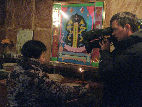 Da Ray von Lu Chaos Großmutter sehr angetan ist, hat er uns empfohlen sie zu interviewen. Wir fragen. Sie tut es. Völlig verblüfft ist Ray allerdings, als Sie uns gestattet den im Nebenraum befindlichen Meichuaquan Schrein nicht nur zu drehen, sondern für uns dort auch Räucherstäbchen anzündet und betet. Auch dürfen wir sie hier interviewen.