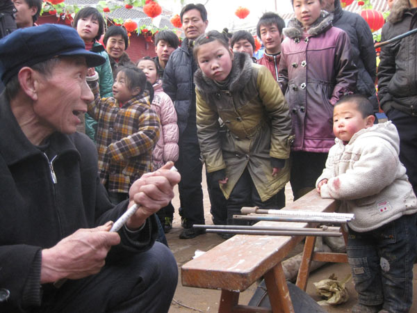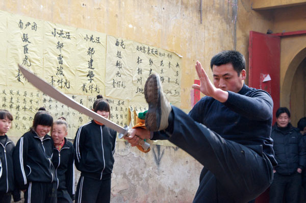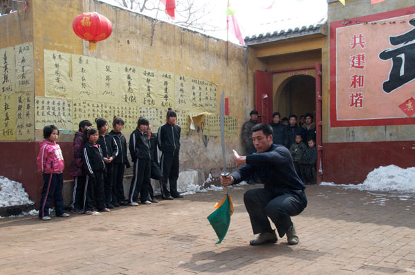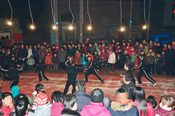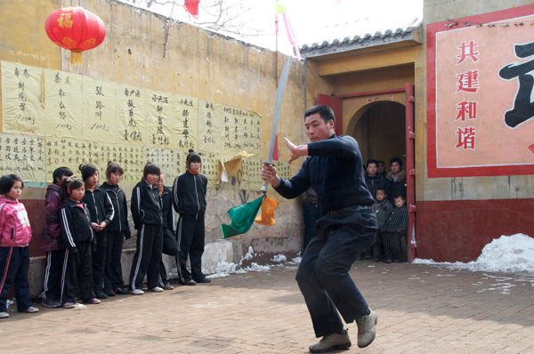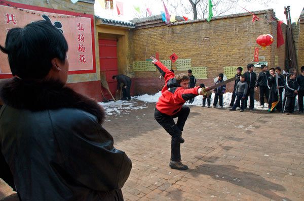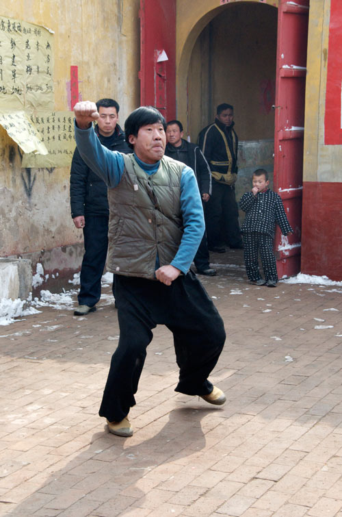 Das Dorf hat einen Meihuaquan Wushumaster eingeladen. Er hat keine Hände, er hat Pranken. Beim gemeinsamen Essen erzählt er dann, er habe diese Hände geformt indem er auf einen mit groben Kieselsteinen gefüllten Sack Stunden und Tage mit der flachen Hand eingeschlagen habe. Handinnenseite, Handrücken immer im Wechsel. Natürlich läßt er sich, der nach eigener Aussage seit 10 Jahren nicht mehr trainiert, nicht nehmen Ziegelsteine zu zerschlagen.