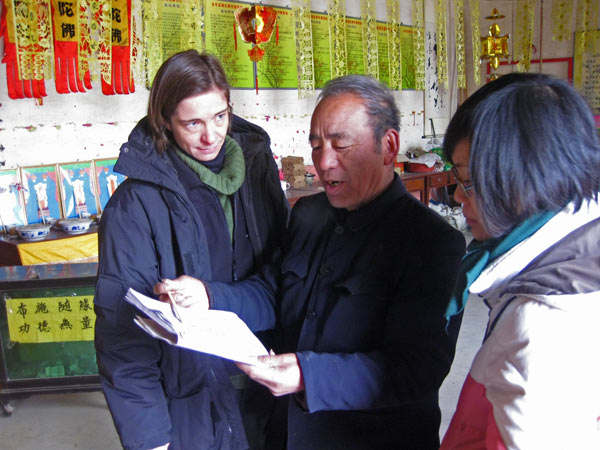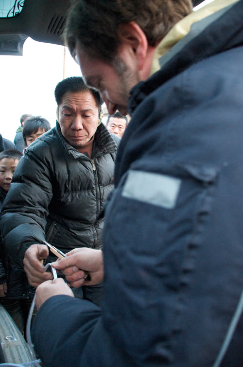 Wir haben uns aufs Feld verkrümelt, es ist uns zu gefährlich auf dem Tempelvorplatz. Unsere Vorsicht ist berechtigt. Der mit Feuerwerk geschmückte Mast der eigentlich von unten nach oben brennen sollte, fängt durch den Funkenregen eines ganz besonders schönen Feuerballs unfreiwillig Feuer, allerdings von oben. Das löst eine heitere Panik unter den Zuschauern aus und gibt uns keine Chance das Zehn-Minuten-Versprechen zu überprüfen. Am Ende sind wir völlig durchgefroren. Dabei sind wir es, die spezial Funktionsklamotten und Daunenjacken tragen. Das Drehmaterial ist, Dank unseres hervorragenden Kameramannes Heiko Käberich, dramatisch schön . Sehr herzlich werden wir verabschiedet, nicht ohne noch mit Spezialitäten der Gegend beschenkt zu werden. Drei anstrengende aber wunderbare Tage gehen zu Ende. Am liebsten würde ich jetzt gleich China für immer verlassen und diesen Eindruck vom unglaublichen Dorf Gucheng durch keine Erfahrung mehr trüben lassen. p.s. Ich wollte ja noch eine Eintragung über die Rückfahrt machen. Wir bekamen keine Rückfahrkarten und mussten die Autobahn nehmen. Da aber der Tenor dieses Berichtes genau der Sorge die ich gerade aufgeschrieben habe Futter gäbe, lasse ich ihn einfach weg und fahre 3 Tage später erst einmal wieder zu meinen Lieben nach Hause. |