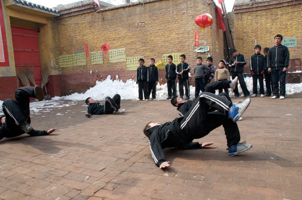 Nach dem Joggen führen die Wushu-Schüler ihre Übungen vor. Außer für die Kleinsten ist diese Übung offensichtlich Pflicht, denn alle anderen führen sie vor. Mit einem Salto befördern sie sich auf den Rücken, bleiben kurz liegen und stemmen sich mit Schwung wieder zurück in den Stand. Nicht nur einer hat sich danach den Hinterkopf gerieben. Schon beim Zuschauen tut das weh.