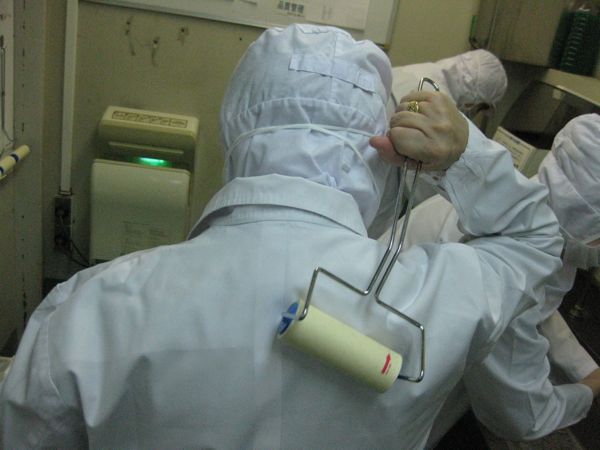 Dann geht es zu einer Schleuse in der wir gesaugt und bedüst werden. Die gleiche Prozedur durchläuft man in jeder Halbleiterfabrik. Hier allerdings sind sie besonders gründlich. Mit einem Kleberoller geht es den verbliebenen Fusseln an den Kragen.