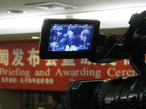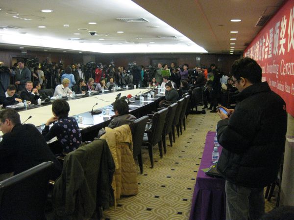 Einen Tag vor der Verleihung des Friedensnobelpreises an Liu Xiaobo fahren wir zum Nobelhotel Beijing News Plaza auf Pekings Prachtstraße Chang An nur wenige Blocks vom Tiananmen, dem Platz des Himmlischen Friedens, entfernt. Vorgestern wurde eine Presseerklärung zur Verleihung des ersten Konfuziusfriedenspreises herausgegeben.Im vierten Stock ist Ein Saal gemietet
