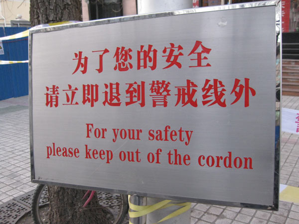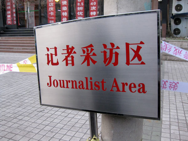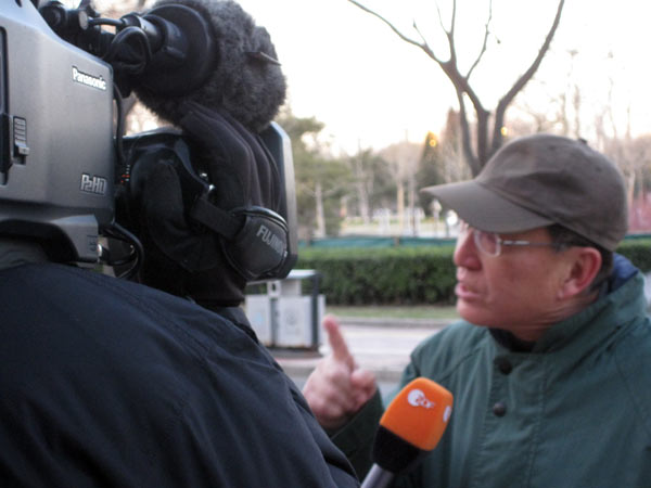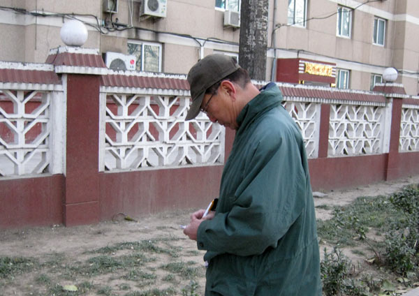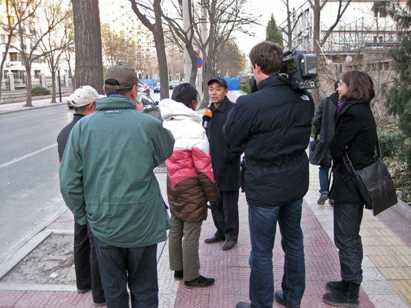 Zum Vordereingang. Mehrere Leute vom Nachbarschaftskommitee mit Armbinden ausgestattet patroulieren auf beiden Seiten der Straße als wir das erste Mal vorbeifahren. Wenden. Sie sind verschwunden. Offensichtlich ist die Entscheidung diese Demonstration der Wachsamkeit zu beenden, aus welchen Gründen auch immer eben getroffen worden. Drei Kamerateams sind schon da als wir dann doch vor dem Haupteingang aussteigen. Natürlich fragen wir ob wir das Gelände betreten dürfen und selbstverständlich wird es uns verwehrt. Probieren mussten wir es aber. Ein paar Passanten geben uns Vox Pops. Sie gehen, im Gegensatz zu Chinas Offiziellen, recht gelassen mit dem Thema um. Natürlich wissen sie Bescheid und natürlich unterstützt keiner die Nobelpreisverleihung. Der Mann mit der grünen Jacke macht sich eifrig Notizen, tut dann aber auch seine Meinung kund.