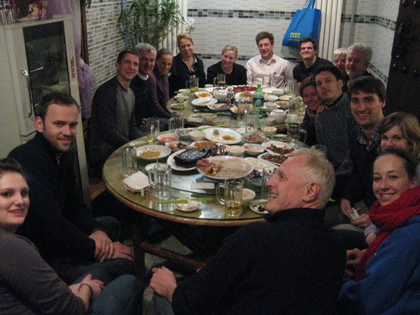 Erst finden sich alle zögerlich zum Gruppenfoto zusammen, doch dann möchte es doch jeder haben. China ist Ende 2010 noch ein Land, in dem man zu zweit (Chris verlässt China auch und wir teilen uns die Feier) mit jeweils umgerechnet 55 Euro einen ganzen Haufen Leute zur Sünde der Völlerei verführen kann. Dieser Nebenraum, im kleinen Jaudzi (Teigtaschen) Restaurant, nicht weit von der Schule entfernt, war oft nach dem Volleyball dem Schlemmern nach dem Sport geweiht.
