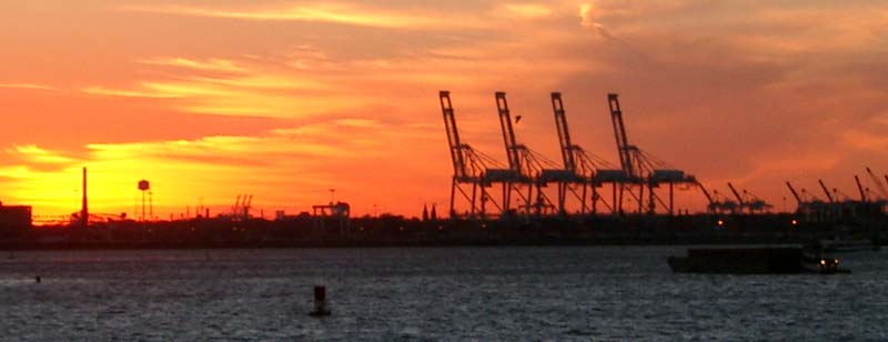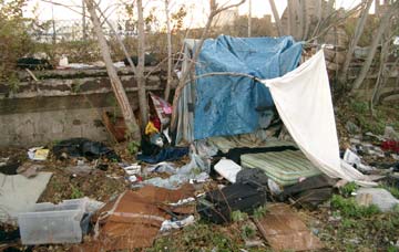 | Ich knipse und laufe weiter. Dann wieder eine Straße, die fast bis ans Ufer führt. Zwei Autos stehen vor so einer Art Elektroumspannhäuschen. Ich stehe ganz vorn und will schon Fotos machen, da klettern vier Latinos auf der Ufermauer um einen Wellblechzaun und kommen auf mich zu. Ich wünsche freundlich guten Morgen und einer von den Vieren grüßt zurück. Ich mache meine Fotos und als ich in Richtung Uferstrasse zurückjogge sehe ich einen Schlafplatz aus einer Matratze alten Decken und schludrig darübergespannten Plastikplanen. | ![]() |