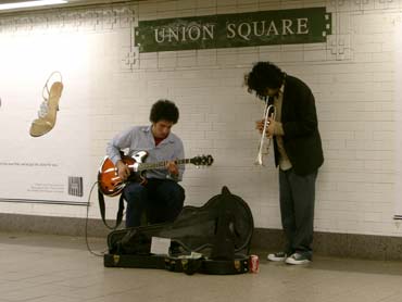 | Es ist 21.38. Ein Gitarrist und ein Trompter spielen am Union Square. Beide sind super. Es ist so eine Art Cooljazz auf Latin im genial halligen Klang des Untergeschosses. Langsam findet sich eine Fangemeinde ein. Nachdem ich das Spiel der Beiden genossen habe, fahre ich hundemüde ins YMCA und maile bis Mitternacht. | ![]() |