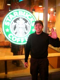 Ich mache gerade ein Foto unter einer Überdachung stehend, da werde ich angesprochen. Ein junger Starbucksmitarbeiter offensichtlich gerade Zigarettenpause genießend spricht mich an. "Hey you should take a shot of the Time Square strait ahead from the NYPD station right there." Dann unterhalten wir uns noch ein wenig und ich fotografiere ihn. Ich halte ihm meine Kopfhörer an die Ohren und erzähle ihm meine Simon und Garfunkelstory, letztes Konzert im Central Park und so. Aber er kennt die beiden nur so vom Namen her. Mit einem: "Enjoy the city.", verabschiedet er sich und verschwindet hinterm Tresen. Ich trinke meinen ersten und letzten New Yorker Starbuckskaffee und schlendere weiter durch den Regen. Hier am Time Square wo irgendwie ständig Stretchlimmos vorbeifahren sind lauter Billigzeugs- und Computershops. Irre. Wie können die die Mieten da zahlen?![]() |